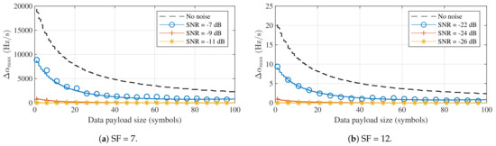 Table 2 clearly shows that constant Doppler rates have a much larger impact on the BER when LoRa packets are considered. For higher spreading factors (11 and 12), errors are observed as a result of relative acceleration values that are relatively high, but not altogether unrealistic in certain body-centric wireless applications. For SF = 7, the relative accelerations that lead to bit errors are much higher, even for a hypothetical satellite-to-body communication system. The relation between the size of the data payload and the denormalized limit of the error-free range is shown for both spreading factors under study in Figure 9, where the same time synchronization and frequency correction as in Figure 8 are assumed.