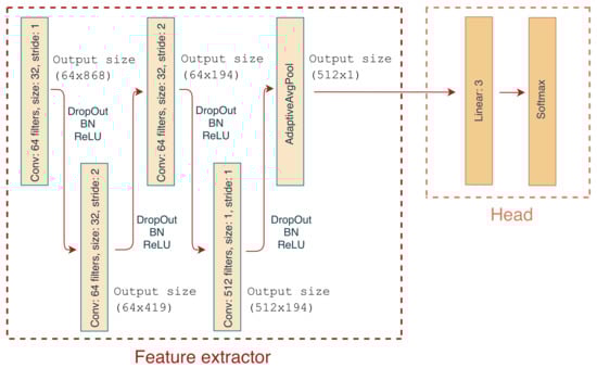 The classifier architecture was based on a multi-class CNN that takes as an input three time series segments (one for each axis x, y and z) and outputs the predicted class. The basic architecture consists of two logical blocks as shown in Figure 5; feature extractor and head. The feature extractor consists of 4 blocks of convolutional Dropout [], BatchNorm [] and ReLU [] layers. The kernel size and strides for all layers is shown in Figure 5. Note that in the last layer, the kernel size is 1 which permits the expansion of the feature map from 64 to 512. Finally, the extractor contains an Adaptive Average Pooling layer to aggregate features on the spatial dimension and create a consistent output size for cases where the input length varies, necessary to allow exploration of the impact of window size on performance described in Section 4.1.3. The head consists of a single fully connected layer with 512 inputs and 3 outputs, followed by Softmax to produce the classified output.