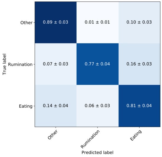 A hyper-parameter search was performed to optimise the number of convolutional blocks in the feature extractor, the kernel size of the convolutional filters and the probabilities of the Dropout layers. The number of filters for the feature extractor is shown in Figure 5 which remained constant throughout the hyper-parameter search. Considering the stochastic nature of model training, the process was repeated 5 times and the model with the highest average score across all 5 folds was selected. A CNN with four convolutional blocks, kernel size of 16 and Dropout probability of 0.25, yielded the best performance. The mean validation performance for these parameters was a score, and of 0.82, 0.83 and 0.82, respectively. The average validation confusion matrix is shown in Figure 6 along with the standard deviation for all cells. For instance, the normalised TP performance for ‘eating’ is 0.81 ± 0.04, while ‘rumination’ is mis-classified as ‘eating’ 0.16 ± 0.03. In all cases the standard deviation is below 0.04. Assuming the average time spent ruminating is around 400 min per day, an increase in sensitivity of 1% would result in an increase of around 4 min of time spent ruminating daily.