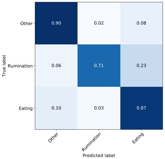 The model with the best performance on the validation set was then selected for evaluation on the test set. The performance of the validation set was score, and of 0.86, 0.87, 0.86, respectively, while the test set score, and of 0.82, 0.84, 0.82, respectively. Finally, the confusion matrix on the test set is shown in Figure 7. Since ‘eating’ and ‘rumination’ are characterised by similar jaw motions, the model suffers the most confusion between these two states; the confusion between other states is significantly lower.