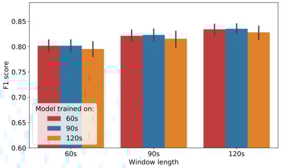 Figure 8, shows the score performance of models trained on 60 s, 90 s and 120 s window lengths and evaluated on 60 s, 90 s and 120 s data. The bar heights represent the average score for the 5-fold cross-validation and for 5 random repetitions for the corresponding models obtained after hyper-parameter tuning (described in Section 4.1.2), while the error bar represents the 95% confidence interval (the Confidence Interval is computed with boot-strapping []) of the performance. Evident is that models trained on 120 s data yield lower performance compared to 60 s and 90 s owing to the severe aggregation of behaviours in 120 s data. The 60 s and 90 s models exhibit almost identical performance, however the 60 s model has lower memory footprint, computational complexity and hence is preferred. It should be noted that the above window size is at odds with the current window length utilised by the commercial collar system such as the Afimilk Silent Herdsman [] and for that reason, the remainder of the evaluation utilises models with window length of 90 s.