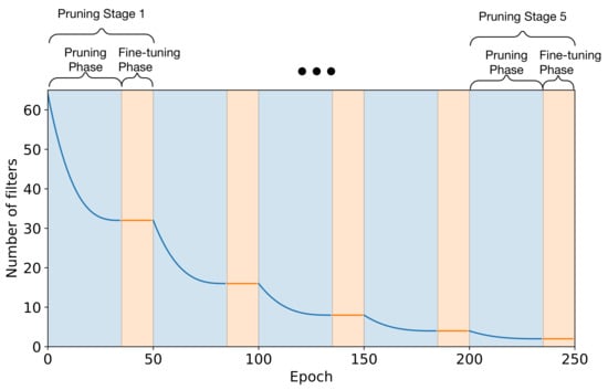 represents sparsity at the end of the pruning phase, i.e., the proportion of filters that need to be pruned, set to 50% for all pruning phases. For the first phase, the filters in each layer are reduced from 64 to 32. The parameter n represents the total number of pruning iterations within each pruning phase and is set to 35 epochs for all phases; parameter t represents the current pruning iteration in the phase; and the parameter defines the pruning frequency, i.e., how often pruning is allowed. In this case was set to 1 thus allowing pruning at every epoch. It is important to note that unpruned filters between stages and iterations are not re-initialised and maintain their values from the preceding process. Finally, after each pruning stage, the network is fine-tuned for an additional 15 epochs before the execution of the next pruning stage. Using this policy yields the pruning profile shown in Figure 9. Training is executed at a constant learning rate of 1 × 10−4 during the pruning phase, as identified by the previous training stage; no learning rate annealing was applied since in every pruning iteration the learning rate is maintained at a constant high value to ensure adequate learning is performed between iterations. However, the fine-tuning phase is executed using the one-cycle training policy described in Section 4.1.1.