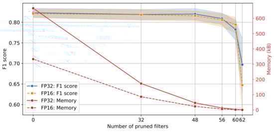 Inspection of Figure 10 and Figure 11 indicates that the model that balances the trade-off between complexity and classification performance is the 48 pruned filters for both single and half precision. Finally, the model was evaluated on the test set and the score performance achieved was 0.82 for both FP32 and FP16, respectively. Test results are summarised in Table 2 for the original (unpruned) and pruned models for FP32 and FP16 precision. Additionally, the estimated weighted performance in terms of the score for the full test data set, without stratification or balancing, for both pruned models with FP32 and FP16 precision was 0.83.