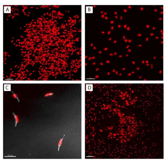 CLSM micrographs of the different cultures, red signal is due to chlorophyll a emission (red channel), white signal to silica cell wall autofluorescence. (A). Phaeodactylum tricornutum culture; (B). Contaminant culture; (C). Details of P. tricornutum fusiform, silica cell walls, white signal; (D). Mix co-culture of P. tricornutum and Contaminant (1:1).