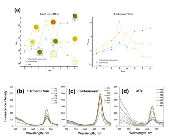 Culture growth curves and fluorescence spectra are reported in Figure 2. As can be seen in Figure 2a, each culture has a distinctive trend. In detail, P. tricornutum OD values (orange line) recorded at 680 and 730 nm, increase from day 0 to day 8, indicating that growth reached its maximum at day 8. This is also clearly visible from the accumulation and color intensity, of the biomass on the filters. Then, a stationary phase followed till day 13, with no significant variations of OD values and then a decline was recorded for P. tricornutum. Contaminant culture (blue line) presents a constant increase of OD values and no plateau was observed, indicating that after 22 days of cultivation the stationary phase had not yet been reached. In contrast, the Mix co-culture (green line) reached the maximum of the growth at day 8 with a trend comparable to P. tricornutum; however, after day 8, OD values decreased sharply, indicating the collapse of the cultures as evidenced by the discoloration at day 22 of the filtrated biomass, compared to the increase in the biomass content of the pure cultures of P. tricornutum and Contaminant. This result seems to suggest that at low culture densities, the P. tricornutum and the contaminant can coexist and grow, while afterwards, once reached a certain density a crash in the co-culture does occur, a phenomenon also described for different biological contaminants that act as pests in algal cultures [44,45,46]. This is confirmed by analyzing the fluorescence spectra of each culture. Figure 2b–d shows the chlorophyll a peak (680 nm) of P. tricornutum, Contaminant and Mix cultures respectively, over the days of the experiment.