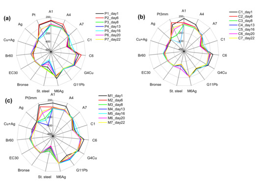 E-tongue system measurements of the three cultures are reported as radar plots in Figure 3, where the output of each single sensor is represented as an individual axis, for the two unialgal cultures and the Mix. Every line corresponds to the consecutive measurement day, while the potential variation range is the same for all the axes (and hence all the sensors), except for the metallic sensors, made of stainless steel and Pt, where the smaller potential range was chosen in order to better represent the differences of these sensor behaviors in different cultures. In fact, as it can be seen in Figure 3, the unialgal cultures have different profiles compared to the Mix.