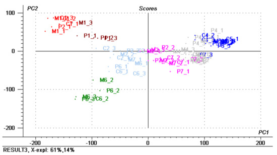 PCA scope plot of P. tricornutum (P) Contaminant (C), and Mix(M) growth over 22 days period. The colors correspond to the different clusters assigned with CA, namely: blue–class 1, red–class 2; green–class 3; light blue–class 4, brown–class 5; grey–class 6; pink–class 7.