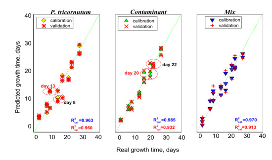 A PLS regression model was built on E-tongue acquired data, in order to predict the culture growth days (represented along the X-axis) for unialgal cultures of P. tricornutum and Contaminant, and for Mix co-cultures during the Cycle II of the microalgae growth monitoring experiment. The model was obtained with 6 latent variables and represents 90.15% of the total system variance. As can be seen from the Figure 5, the E-tongue output data allowed a good prediction model for the culture growth time expressed as days, with R2 values for validation which varied in a range from 0.913 to 0.960 and RMSEV of 1.97–2.38 days.