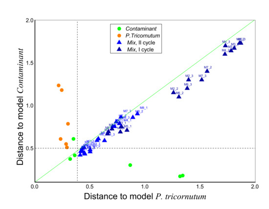 The possibility to discriminate the Mix co-culture from pure monocultures P. tricornutum and Contaminant was investigated with Soft independent modelling by class analogy (SIMCA), Figure 6. For this, two individual models corresponding to the P. tricornutum and the Contaminant measured for a first day of growth experiment of two measurement cycles, I and II were built first, and then the Mix samples at different stages of co-culture growth were classified as unknown samples. As can be seen from the Figure 6, most of the Mix samples were identified as not belonging to the pure cultures, and this classification was irrespective of the culture growth dynamics. Moreover, upon growth, the Mix co-culture resembles a higher degree to the Contaminant, rather than to the P. tricornutum, which is expressed by higher sample coordinate values along the X-axis, representing the sample distance to Model P. tricornutum in comparison to the shorter distances to Model Contaminant (scores values along Y-axis).