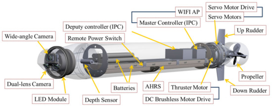 The interior structure of the AUV, such as the drive mechanism and various control components, comprises three parts: the bow, the parallel middle body, and the stern. The bow is installed with the image system and LED apertures. The parallel middle body contains the attitude and heading reference system (AHRS), electric power equipment, communication equipment, and controllers. The stern section has a propeller and four sets of independent rudders. The AHRS module used in this study includes a multi-axis magnetometer, gyroscope, and accelerometer. It can perceive the AUV’s pitch, roll, and yaw motion variables in space; an ultra-slim and fanless PC is used as the main controller for the integration of all systems, as shown in Figure 1. On the other hand, the AUV architecture is presented in Figure 2. The aim of this study is to integrate these image-processing methods into the AUV for realizing dynamic and real-time visual tracking. Since the identification and control system considered in the AUV is subject to the power consumption and the performance of the processor, it would be more efficient to use the present methods than complex deep-learning methods.