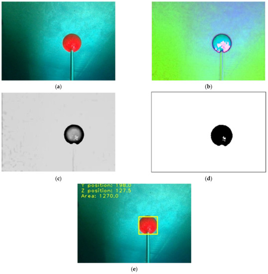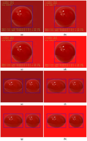 In order to discuss the robustness of the present image-processing method, an experiment with similar objects and similarly colored backgrounds was implemented, as shown in Table 1 and Figure 5a–h. In the experiment, the thresholds of the HSV values when identifying the objects in similarly colored backgrounds were analyzed. It is apparent that the image-processing methods in this study are able to identify the object by adjusting the thresholds of the HSV values. However, if there are two different objects of the same color, e.g., a sphere and an ellipsoid, the image-processing methods would select both of them as the ROI simultaneously. In a future study, a more robust image-processing method, such as a Region-Based Convolutional Neural Network (R-CNN) [54], would be considered to recognize the features of the different morphologies in the same color.