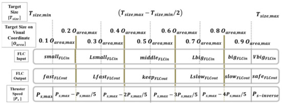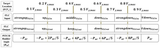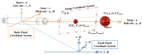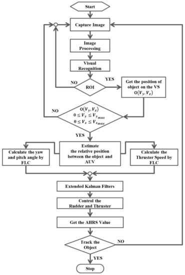 In the flowchart, the object mapped onto the image coordinate system can be calculated when the ROI is selected. Subsequently, the information obtained from the ROI would enter the procedure for the propeller and rudder controls by using the FLC. In order to improve performances of the propeller and rudder controls, the output control values, i.e., yaw angle , pitch angle , and propeller revolution speed of the FLC, in the preceding 15 s would be adopted as the input data of the EKF, and the AUV motion control can be performed by using the predicted data of the EKF.