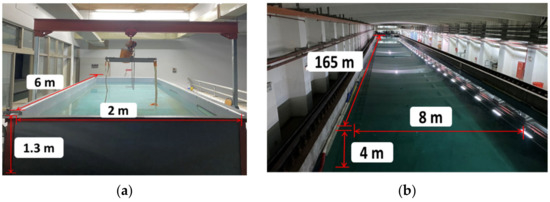 The stability water tank of NCKU is 6 m in length, 2 m in width, and 1.3 m in depth. The towing tank of NCKU is 165 m in length and 8 m in width, and the working water depth is 4 m. The exterior and the dimensions of the stability water tank and the towing tank are indicated in Figure 12a,b, respectively.
