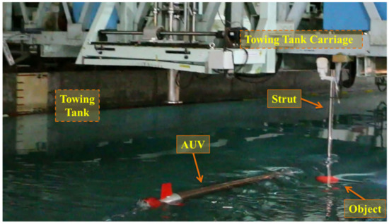 This study was conducted in both a stability water tank and a towing tank. The stability water tank was used to test the vehicle’s attitude adjustment, buoyancy balance, water-tightness, payload control, and examined for image-recognition processing. Finally, the test results were introduced into the AUV for the dynamic experiment in the towing tank. The target used for the underwater recognition was a red ball of 24 cm in diameter, fastened to the support frame, and installed securely onto the towing carriage. The object was submerged in the water; the top of the object was 0.14 m away from the water surface, and the minimal safety distance between the object and the AUV was 0.18 m; the experimental environment is presented in Figure 13 and Figure 14. During the experiment, the movement of the towing carriage drove the object, and the image-based navigation system was tested under various speed conditions of the object.