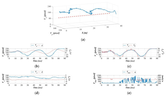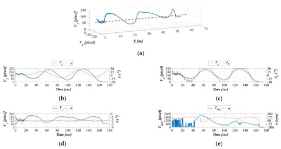 Figure 16, Figure 17, Figure 18 and Figure 19 present the AHRS measurements when the object moved at speeds of 0.2, 0.4, 0.6, and 0.8 m/s during the dynamic experiments. Figure 16a–e presents the results of the dynamic experiment with the object moving at 0.2 m/s; in order, the figure presents the relationship of the object’s displacement trajectory in the vehicle’s image coordinate system with that in the earth-fixed coordinates system (Figure 16a), the time series of the target object on the vehicle’s image coordinate system Y-axis and the AUV’s yaw angle on the body-fixed coordinates system (Figure 16b), the time series of the target object on the vehicle image coordinate system Y-axis and the AUV vertical rudder (Figure 16c), the time series of the target object on the vehicle image coordinate system Z-axis and the AUV’s pitch angle on the body-fixed coordinates system (Figure 16d), and the time series of the target’s area size on the vehicle image coordinate system and the AUV propeller revolution speed (Figure 16e).