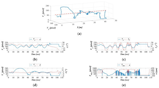 Dynamic guidance experiment with a towing speed of 0.8 m/s. (a) Displacement trajectory on the image coordinates, (b) time series of the image coordinate Y−axis and AUV yaw angle, (c) time series of image coordinate Y−axis and AUV vertical rudder, (d) time series of the image coordinate Z−axis and the AUV vertical rudder, and (e) time series of the image coordinate surface area and the AUV propeller revolution speed.