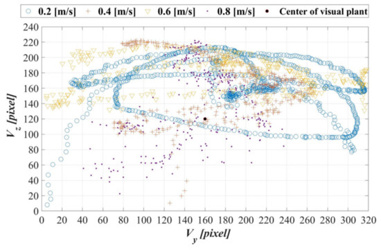 Figure 20 presents the image coordinate system logs of the AUV in the dynamic guidance experiments with towing speeds of 0.2, 0.4, 0.6, and 0.8 m/s. The experimental results indicated that, under these four towing speeds, the AUV could track the object in real-time and maintain the target object in the vehicle image coordinate system. With the acceleration of the towing speed, the experimental data gradually became more centralized, especially in the image coordinate Y-axis (). This finding highlights that the moving speed of the target object is a factor affecting the AUV tracking efficiency.