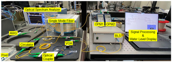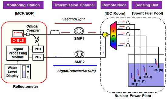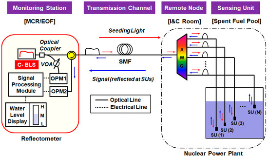 Water is a crucial resource to nuclear power plants (NPPs), especially for the pressurized water reactor. For example, the water inside the spent (or storage) fuel pool (SFP) of NPPs not only cools down the decay heat but also prevents any possible leaks of radiation fields [1,2]. Thus, information regarding the water (such as level, temperature, radiation dose level, etc.) must be provided to the main control room (or emergency operation facility) even after the physical damages caused by various natural hazards such as tsunami, earthquakes, etc. As we observed in the Daiichi NPP accident of Fukushima, however, such catastrophic events severely impair the water management (e.g., monitoring) system, especially due to the loss of electric power [3]. Subsequently, the Nuclear Regulatory Commission (NRC) issued an order to require all the United State’s NPPs to install water level instrumentation in their SFPs with three distinct water levels that could be remotely reported [4]. This indicates there are new needs for technologies to remotely monitor the water status without electrical power supplied to the local field for surviving a variety of harsh environments caused by high temperature and radiations. In response to this, a remote-sensing network employing optical fiber sensors (OFS) has been proposed in recent years [2,5,6,7]. The OFS network has been drawing increasing attention due to various advantages such as passive/remote-sensing features, and excellent tolerance towards electromagnetic inferences and radiations. Moreover, it can be readily applied to many different industrial fields, including hot spot monitoring for electrical power cables, external intrusion, railway monitoring, structural health monitoring, etc. [8,9,10,11].