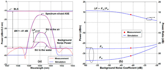 Fresnel reflections in the air and water. (a) Measured and simulated optical spectra for single channel. (b) Fresnel reflection power ratio () according to the background noise coefficient.