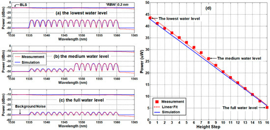 Simulation and measurement results according to the water level in the back-to-back condition: (a) the spectra of lowest water level, (b) the spectra of 1/2 water level, (c) the spectra of full water level, and (d) the received optical power as a function of the water level.