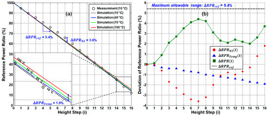 Next, we analyzed in comparison to . In Figure 5b, (see the red circles) is obtained from the actual measurement (being less than 3.6% at maximum) while (see the blue triangles) is obtained from the simulation. Then, we obtain (see the green rectangles) by adding the absolute values of each deviation (i.e., ), as Equation (10) explains. The maximum value of was ~4.4% at , which is below (i.e., 5.4%). Thus, the system stays reliable during operation in the back-to-back condition.