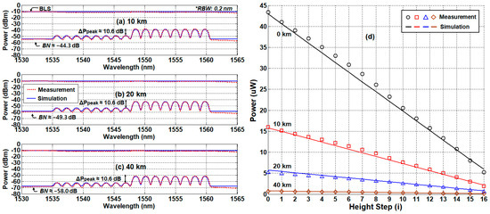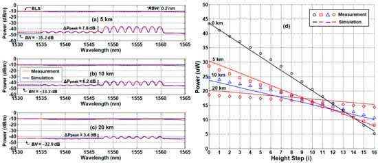 Figure 8a–c is the measured/simulated optical spectra of the received signal at three different distances (10 km, 20 km, and 40 km) that confirm two things we expected: (i) RBS is gone, and (ii) the background noise is further reduced due to the fiber attenuation. The spectral peak power ratio () was maintained at 10.6 dB, while the sensing distance increases. This implies that the dynamic range can be maintained regardless of the sensing distance. As such, the SMF-induced signal attenuation remains the only factor that degrades the performance of the remote-sensing system. For qualitative verification, we measured the received optical power () as a function of water level for various distances (10 km, 20 km, and 40 km), Figure 8d. We also plotted the total received optical power of the back-to-back condition as a reference. Similar to the single-path network configuration, the total received optical power according to the water level decreases as the water level increases. In addition, the slope of decreases as the sensing distance increases due to the SMF loss. However, the offset of each curve is reduced, too, maintaining the dynamic range.