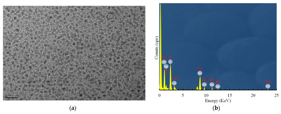 (a) TEM image of CdSe/ZnS QDs at a resolution of 20 nm and (b) EDX analysis results for CdSe/ZnS QDs.