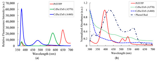 (a) Emission and (b) absorption spectra of PtTFPP, CdSe/ZnS (A570), and (A460) QDs.