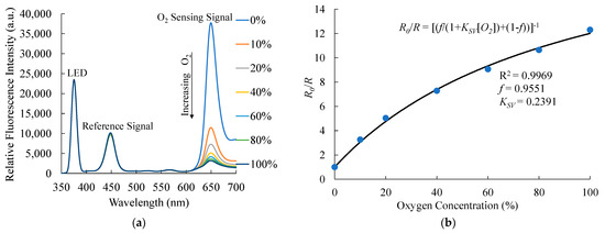 (a) Response of the optical dual sensor under exposure to different O2 concentrations and (b) Stern-Volmer plots.