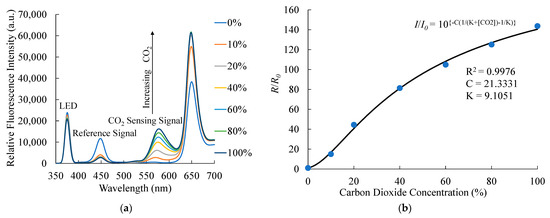 where C is a constant and K is the equilibrium constant. With the increase in the concentration, the CO2 sensitivity increases, exhibiting the maximum value at 100% of CO2. The calibration plot in Figure 5b reveals the relationship between ratiometric sensitivity (R0/R) and the different CO2 concentrations by Equation (2). The ratiometric sensitivity of the optical dual sensor for CO2 is estimated to be 144.