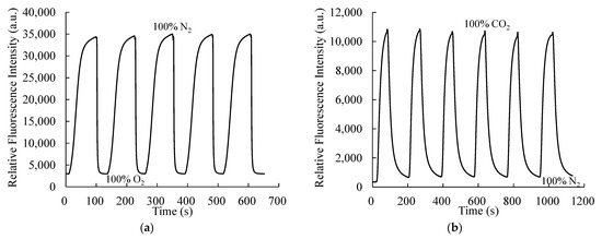 For practical applications, sensors should exhibit a rapid response and recovery. Herein, the response and recovery of the fluorescence signals for the respective gases are individually calculated. The response and recovery represent the time taken by the optical sensor to achieve 90% of its final intensity and 90% of its initial intensity, respectively. For O2 response and recovery, the optical dual sensor is initially placed under 100% N2 and then switched to 100% O2 for 30 s, followed by switching again to 100% N2 for 60 s; this process is repeated for five cycles. Figure 6a shows the obtained plot. Figure 6a shows the response and recovery characteristics of the optical dual sensor for around 650 s in the presence and absence of O2. The PtTFPP complex completely recovers its fluorescence intensity after complete quenching at 100% O2. The response time taken for O2 to quench 90% of the intensity of PtTFPP complex is 10 s, while that taken to recover 90% of the quenched intensity is 35 s. Similarly, the response and recovery of the optical dual sensor for CO2 is calculated. Herein, the optical dual sensor is switched to 100% CO2 from 100% N2 and maintained for 60 s and then again switched back to 100% N2 for 90 s. Figure 6b shows the results where this process is repeated for six complete cycles over 1200 s. The corresponding response and recovery times for CO2 are calculated to be 20 and 60 s, respectively.