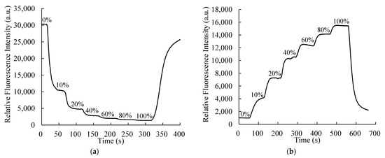Similarly, Figure 5 shows the changes in the fluorescence signals upon exposure of the optical dual sensor to different CO2 concentrations. As expected, with the increase in the CO2 concentration from 0% to 100%, the fluorescence intensity of CdSe/ZnS (A570) QDs at 570 nm considerably increases. The intensity change is proportional to the applied concentration according to the Stern–Volmer equation. In principle, with the increase in the CO2 concentration, the absorption of phenol red at 570 nm decreases; hence, the observed fluorescence intensity of QDs increases. The relationship between the observed emission intensity of the CO2-sensing material and CO2 concentration follows Equation (2) [34]:
