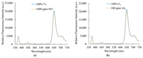 The presence of certain other gases under practical conditions sometimes creates interference in the appropriate operation of the gas sensor. Therefore, the selectivity of a gas sensor is also a key property to be considered. Herein, the response of the ratiometric dual sensor in the presence of nitric oxide (NO) and ammonia (NH3) was investigated. The proposed dual sensor is alternately exposed to both gases for 15 min to observe changes in fluorescence intensities. Figure 8 shows the obtained results. Under 1000 ppm NO, the fluorescence intensities of the sensor exhibit an almost negligible change. Similarly, changes are not observed in the presence of 100 ppm NH3. These results confirm that the proposed ratiometric dual sensor does not exhibit any interference by NH3 and NO.