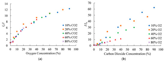 Figure 4 shows the fluorescence intensity response of the dual sensor in the presence of different O2 concentrations. As expected, the fluorescence intensity of PtTFPP at 650 nm is selectively quenched considerably. With the increase in applied O2 concentration up to 100%, the quenching of the fluorescence intensity increases continuously, confirming that intensity quenching is proportional to the applied concentration. At higher O2 concentrations, the presence of increased number of oxygen molecules causes a larger number of molecular collisions and hence an increased extent of quenching. Moreover, the maximum intensity quenching is observed at low O2 concentrations, indicating that the sensor exhibits higher sensitivity at low O2 concentrations. Notably, intensities of the other fluorescence signals are unaffected or exhibit a negligible effect in the presence of O2, facilitating the detection of CO2 without any interferences. The response of the ratiometric sensor can be evaluated by R0 and R in the Stern–Volmer equation [33]: