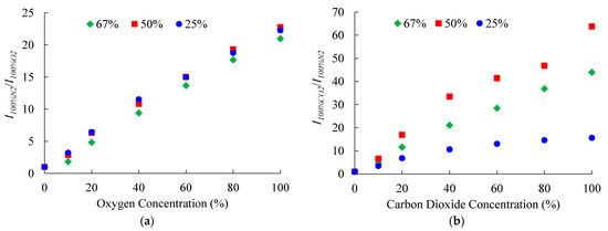 The ratiometric dual sensor is placed in different humid environments to observe changes in sensitivities for O2 and CO2. Figure 10 plots the sensitivities calculated at three values of relative humidity (RH) for different gaseous concentrations. The results in Figure 10a reveal no significant changes in the O2 sensitivities, while the CO2 sensitivity increases with the decrease in the RH value from 67% to 50%. However, with the further decrease in RH to 25%, the sensitivity decreases to its lowest value.