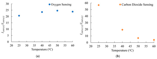 Effect of temperature on the sensitivities of (a) O2 and (b) CO2 of the optical dual sensor.