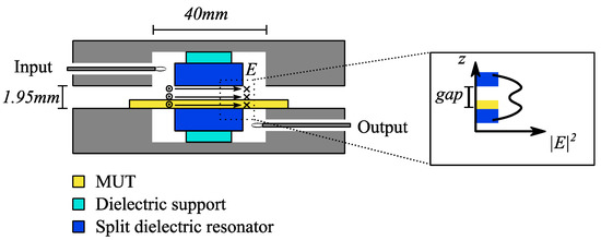 Sketch of the split-post dielectric resonator measurement setup. The MUT is placed in a gap, which separates the dielectric resonator. The electric field in this gap is strong, therefore, the device is sensitive to a change of dielectric constant introduced by the MUT. The change of the field strength along the gap inside the resonator is displayed as well. The E-field is strongest at the edges of the gap close to the resonator and weakest in the center of the gap.