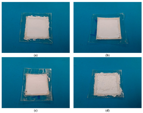 Photographs of dielectric paste samples [27] and their fixtures and substrates for different weight percentages of the BST powder are shown in Figure 3. For relatively low contents of the BST (40%, 60%, and 70%), the paste is smooth, as shown in Figure 3a–c. When the BST content was further increased, the paste started to become increasingly viscous. Eventually, the BST content was so high that the dielectric paste started to have cracks after drying, resulting in poor mechanical properties. This is the case for a BST content of more than 80% and is shown in Figure 3d. A rough surface and cracks can be observed all along the surface of the sample. Due to the increased viscosity in its liquid state, the paste with more than 80% BST weight content was also very difficult to handle, because it turned very sticky, and processing it into a smooth surface was nearly impossible. It was also found that the paste was very brittle after drying for such high BST contents and, thus, may not be suitable for practical applications. On the other hand, for lower weight percentages of the BST powder, the mechanical properties were mainly dominated by the silicone rubber, and thus, smooth surfaces were achieved, as seen from Figure 3a–c.