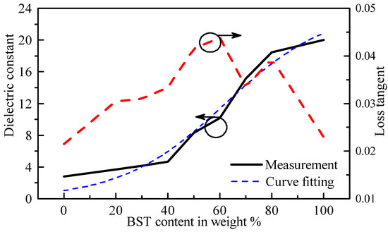 where x denotes the amount of BST in weight percent that is mixed with the silicone. The curve is fitted to the measured results of the paste’s dielectric constant, as shown in Figure 4. The fitted curve agrees reasonably well with the measured results and could serve as a starting point for determining the desired dielectric constant of the paste depending on the BST content.