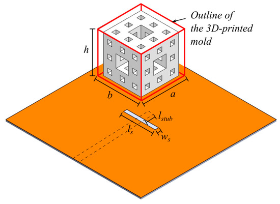 In this section, the structure of the antenna, which will serve as an example design for the use of the dielectric paste, will be analyzed. The basic antenna shape is based on the so called menger sponge fractal. An illustration of the second iteration of a menger sponge fractal DRA is shown in Figure 5. A microstripline slot feeding is used to excite the DRA, as indicated by the dashed line in Figure 5. The slot has a length and width of ls and ws, respectively. The microstripline has a width of wstrip and extends the slot by a length of lstub. The shape of the menger sponge DRA is defined by an enclosure or mold (depicted by the red solid line in Figure 5), which ensures that the dielectric paste (depicted in white color) in its liquid form stayed in place after being inserted into the mold. The mold was obtained by 3D-printing, and the mold material has a dielectric constant of 3. The inside of the mold was then filled with a dielectric paste of dielectric constant 10.14, corresponding to a dielectric paste with 60% BST content. The DRA has a length, width and height of a, b and h, respectively. The basic shape of the menger sponge fractal consists of a cube with openings inside the dielectric paste in each of the faces, penetrating from one face to the adjacent face on the opposite side of the cube. The openings are realized in practice by using the mold to shape the dielectric paste. The mold itself corresponds to the negative of the shape of the dielectric paste or the menger sponge fractal shape. With an increasing number of iterations of the menger sponge fractal structure, the amount of removed dielectric paste material sections is increased.