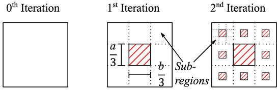 The construction principle of the menger sponge fractal for different iterations is illustrated in Figure 6 using a single face of the 3-dimensional structure as an example. For the 0th iteration, the menger sponge fractal corresponds to a cube with no parts of the structure removed.