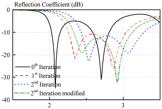 After the first iteration, the two resonant modes are spaced much more closely (approximately 0.52 GHz) and give rise to a much wider impedance bandwidth. The bandwidths for the 0th iteration are 5.3% (2.03 GHz to 2.14 GHz) and 8.5% (2.58 GHz to 2.81 GHz). After the first iteration, the bandwidth was improved to 29.4% (2.26 GHz to 3.04 GHz).