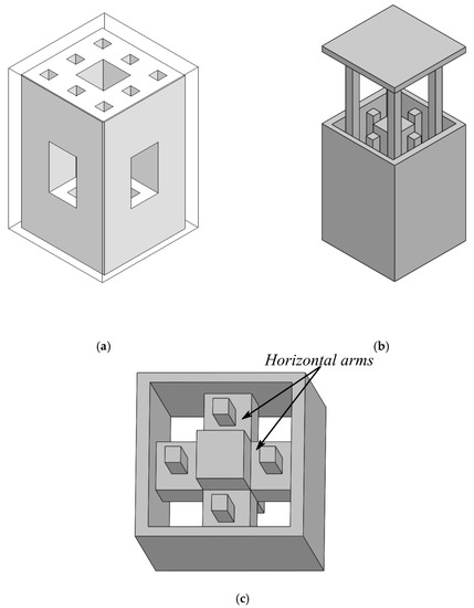 (a) Modified menger sponge fractal DRA structure. The dielectric paste is highlighted in white, whereas the outer part of the plastic mold is indicated by a solid line. As compared to the original menger sponge (see Figure 5), the horizontal bars of the second iteration have been removed in order to allow for an easier fabrication. (b) Exploded view of the 3D-printed mold structure, which is used for manufacturing process. The mold is split into two parts allowing for an easier manufacturing. The mold is then subsequently filled with the dielectric paste material. (c) Perspective view of the inside of the 3D-printed mold showing the horizontal arms that give rise to the “holes” in the dielectric paste in (a).