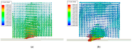 In order to analyze the operating mechanism of the circularly polarized antenna, the resonant modes inside the linearly polarized antenna, excited by a simple slot as shown in Figure 5, are characterized first. The electric field distribution of the modified menger sponge fed by a simple slot are shown in Figure 9a,b at their resonance frequencies at 2.45 GHz and 2.9 GHz (compare Figure 7), respectively. The field distributions at 2.45 GHz indicate that the DRA operates in its fundamental TEδ11 mode. At 2.9 GHz, the field distributions resemble those of the TEδ13 mode.