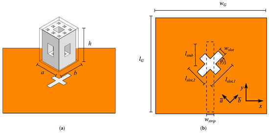 Using the cross-slot arrangement, orthogonal DRA modes can be excited. In particular, the slot with length lslot,1 excites TEb modes, whereas the slot with length lslot,2 excites TEa modes, where the superscripts a and b denote the directions along the dimensions a and b of the DRA, as indicated by the vectors a and b in Figure 10b. Because the slots have different lengths, the resonance frequencies of the orthogonal modes are slightly different. This translates to the modes resonating with different phases with respect to each other. For the right choice of the slot lengths, the phase difference is approximately 90°, resulting in circular polarization. In this design, each slot excites two DRA modes, namely, TEa/b δ11 and TEa/b δ13, thus, wide axial ratio bandwidth is achieved.