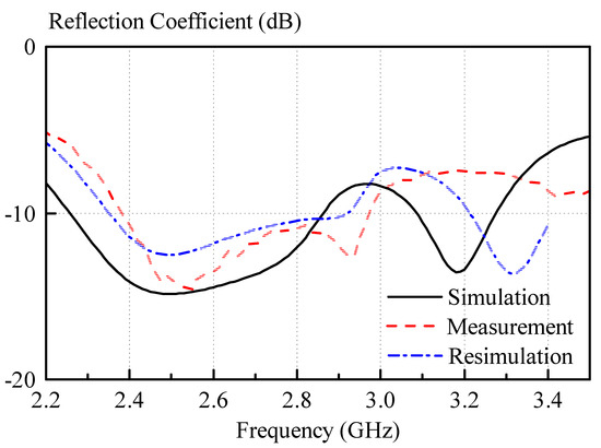 Measured and simulated reflection coefficients. The measured and simulated impedance bandwidth are 21.6% (2.39–2.97 GHz) and 23.4% (2.26–2.86 GHz). For the resimulation, the following values have been used: a = 24 mm, b = 24 mm, and a dielectric constant of the dielectric paste of εr,paste = 9.5.