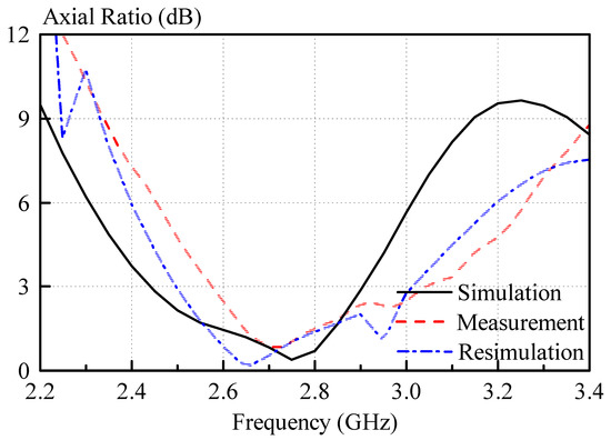 The antenna was resimulated, taking into account measurement inaccuracies of the dielectric constant and manufacturing tolerances of the 3D-printed mold, and the results are shown in Figure 12 and Figure 13. Much better agreement with the measured results can be observed for the resimulated antenna for both reflection coefficient, as well as axial ratio.