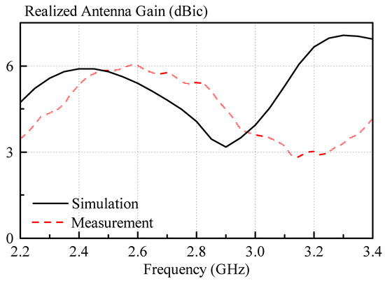 The measured and simulated broadside gains of the circularly polarized antenna are shown in Figure 14. A maximum measured broadside gain of 6 dBic was found, whereas the simulated counterpart was 5.9 dBic, at 2.6 GHz and 2.4 GHz, respectively.