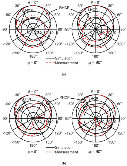 The measured and simulated radiation patterns are shown in Figure 15a at 2.6 GHz and in Figure 15b at 2.9 GHz for φ = 0° and φ = 90°, respectively. Good agreement with the simulated results was found, and the backlobe radiation of the antenna is generally much lower than −10 dB. The cross polarization (or left hand circularly polarized radiation) is generally low and close to −10 dB. Stable broadside radiation over the whole antenna passband is observed.