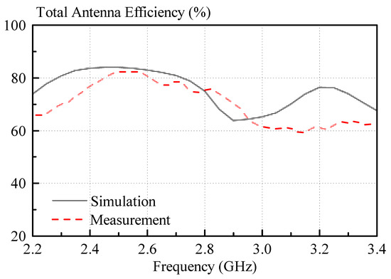 A comparison of the measured and simulated reflection coefficients of the antenna prototype is given in Figure 12. With reference to the figure, reasonable agreement was obtained, and the measured and simulated impedance bandwidth are 21.6% (2.39–2.97 GHz) and 23.4% (2.26–2.86 GHz), respectively.